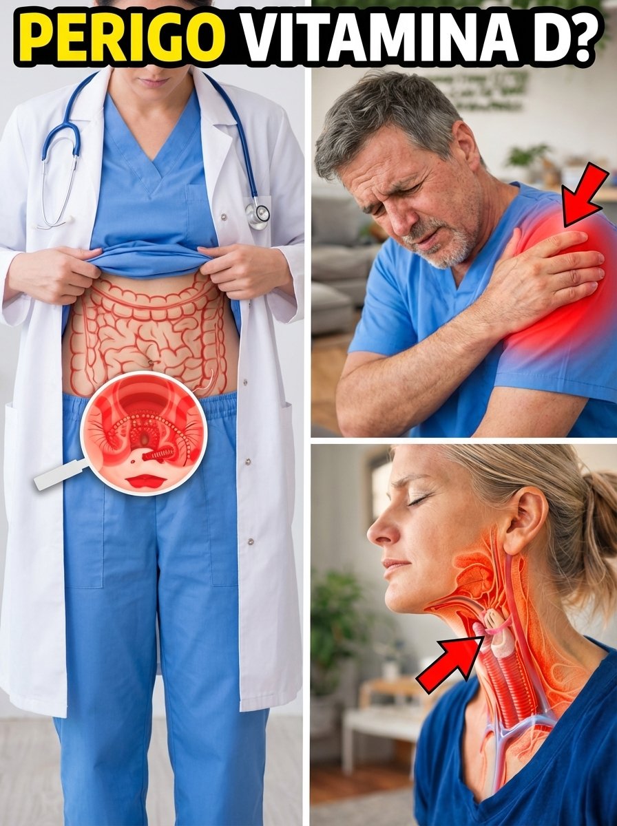O excesso de vitamina D pode levar à hipercalcemia — aumento do cálcio no sangue. Isso acontece porque ela intensifica a absorção de cálcio no intestino.