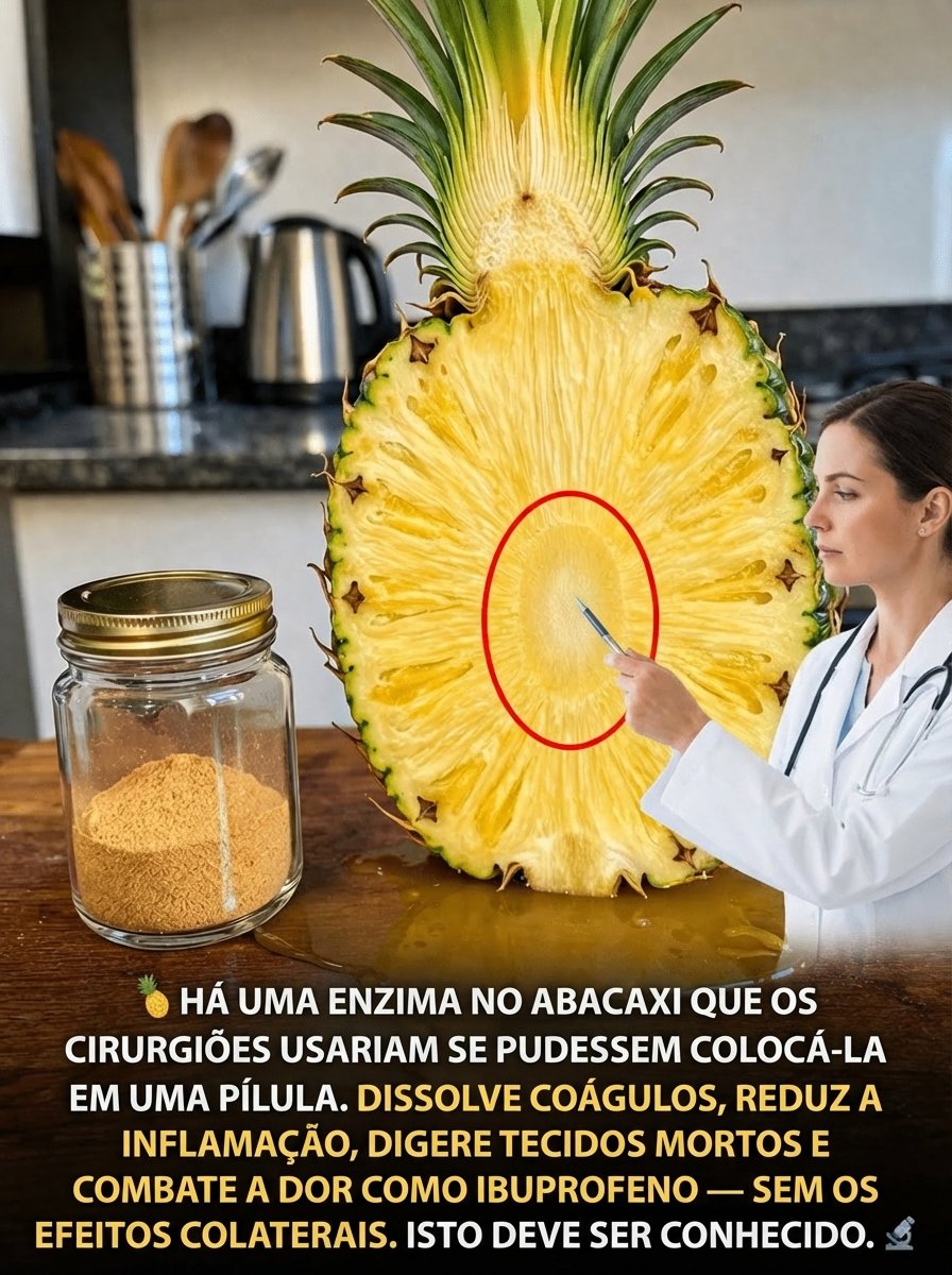 Mas aqui está o detalhe: esse miolo descartado esconde algo especial. Dentro dele existe uma enzima natural chamada bromelina, que muita gente nunca chega a aproveitar. E quando você entende o que ela pode oferecer, talvez pense duas vezes antes de jogá-lo fora.