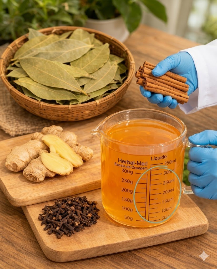Este chá combina quatro ingredientes usados há séculos na medicina natural. O gengibre contém gingerol, responsável por seu efeito aquecedor e digestivo. As folhas de louro trazem compostos como o cineol, que ajudam a relaxar o corpo. A canela adiciona profundidade e possui cinamaldeído, enquanto o cravo é rico em eugenol, um poderoso antioxidante.