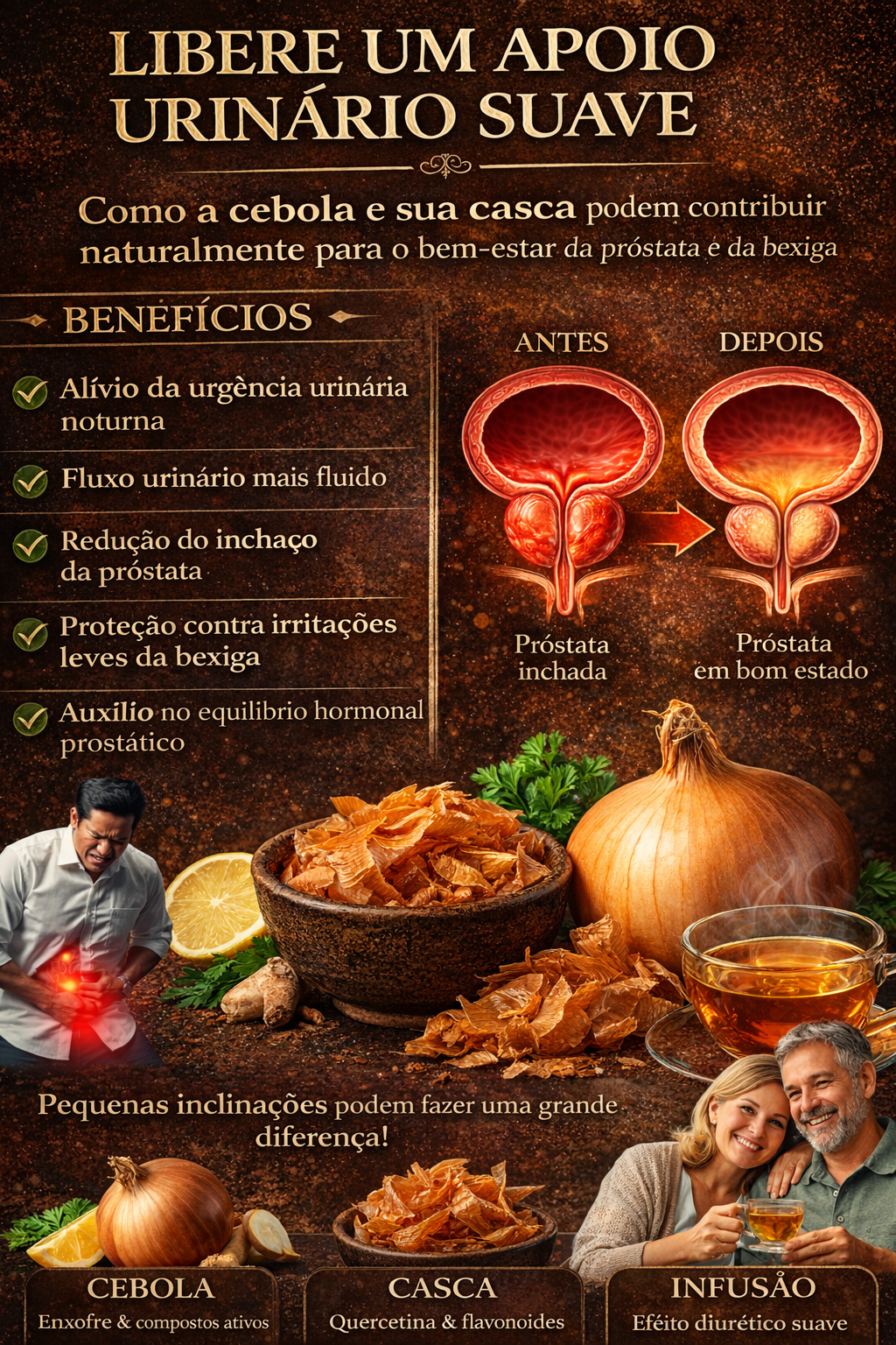Irritantes do dia a dia — cafeína, estresse, pouca hidratação — alimentam o desconforto urinário. A próstata pode inchar e pressionar a bexiga como um dedo apertando uma mangueira. Muitos idosos relatam escapes ou urgência frequente; sem cuidado, isso rouba o sono e a confiança. E se o ardor da cebola ajudasse a acalmar essa sensação?
