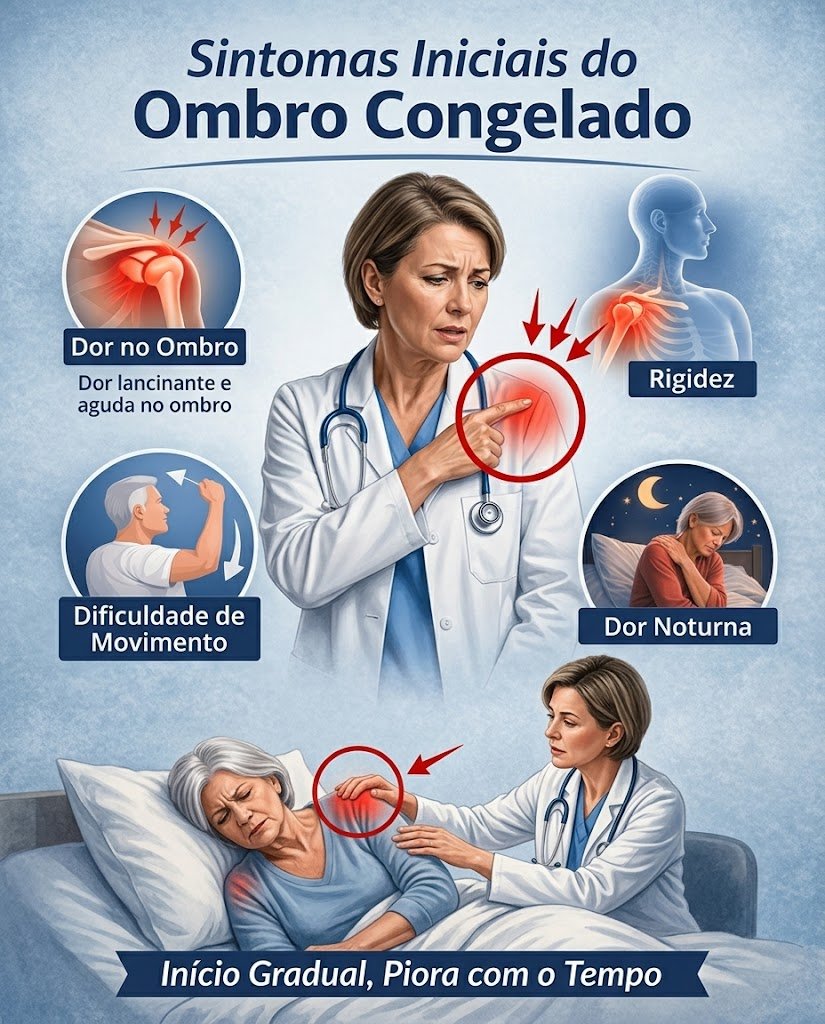 Esses sintomas costumam evoluir em fases: primeiro a dor aumenta (“congelamento”), depois a rigidez predomina (“congelado”), e por fim ocorre uma melhora gradual (“descongelamento”).